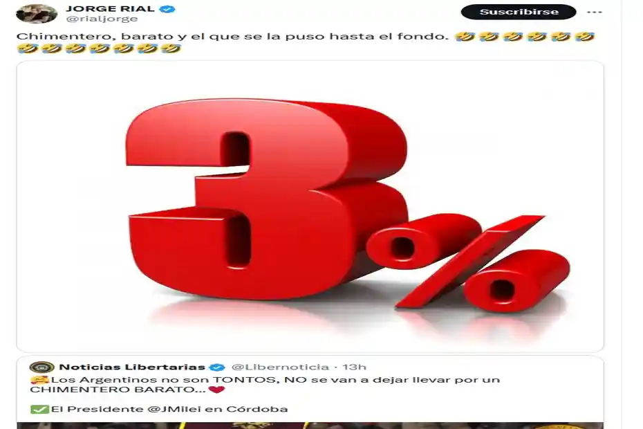 La respuesta de Rial no tardó. Fiel a su estilo y aprovechando el impulso del término elegido por Milei, el periodista devolvió: “Chimentero, barato y el que se la puso hasta el fondo”, junto con emojis de risa y una imagen que remarca el “3%”.