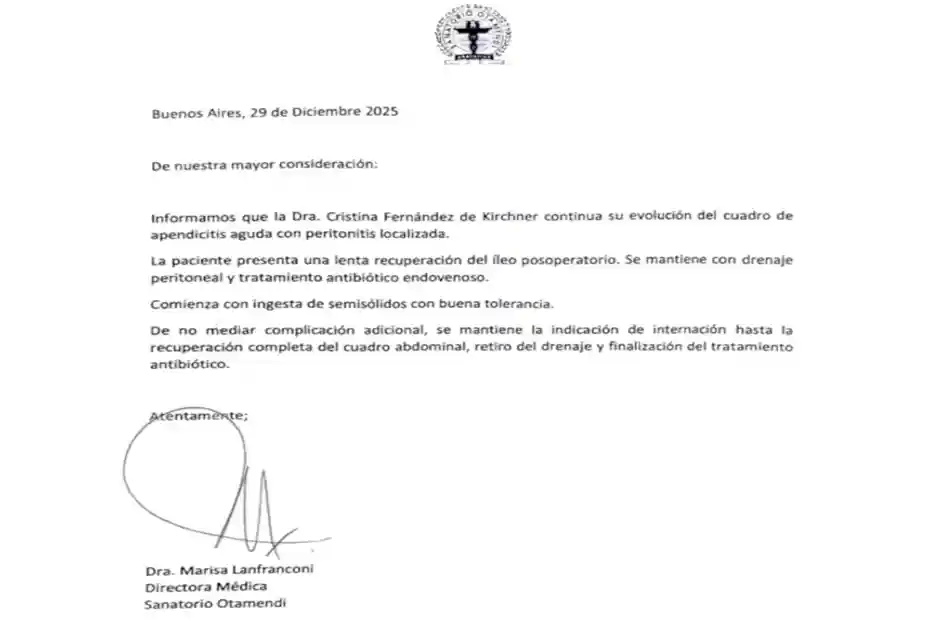El Sanatorio Otamendi emitió este lunes un nuevo nuevo parte médico sobre el estado de salud de la expresidenta Cristina Fernández de Kirchner, quien se encuentra internada desde la noche del pasado 20 de diciembre en la Ciudad de Buenos Aires. Según el comunicado oficial, la paciente “presenta una lenta recuperación” luego de haber sido sometida a una intervención quirúrgica por un cuadro de apendicitis aguda con peritonitis localizada.
